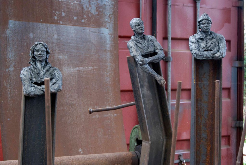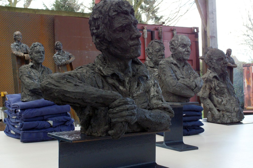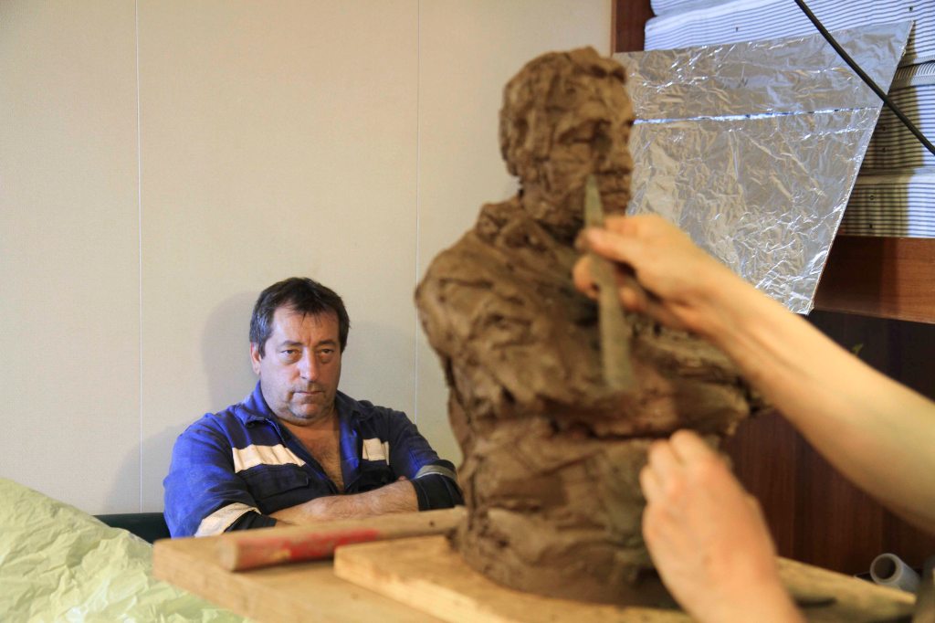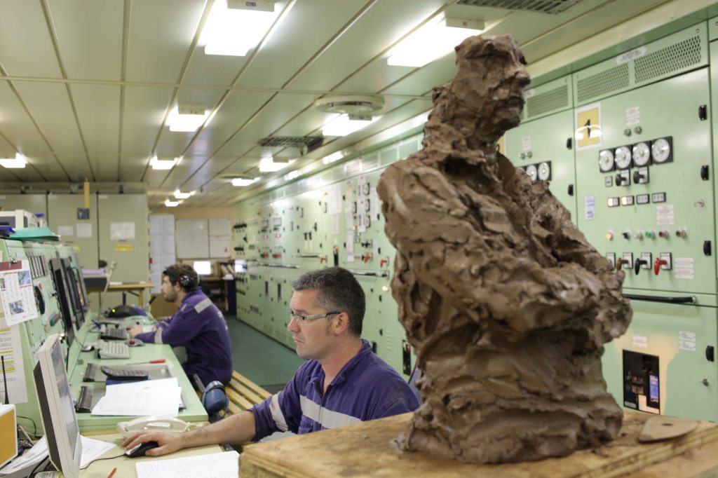 14 avril S’accrocher à la sculpture prend ici un sens très incarné. Les roulements permanents et doux du navire, sur une mer pourtant très calme la plupart du temps, m’obligent à bloquer les roues des sellettes, qui roulent sinon elles aussi. Une jambe calée contre la sellette, comme chacun ici cherche des appuis sans même y penser. Les portraits des hommes du bord s’annoncent solidement ancrés, adossés, posés. Fragmentés.